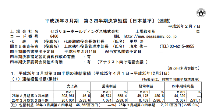 続いては決算発表系のニュースを。メーカーさんはセガサミーホールディングスですね。結論かなりの前年対比アップ、営業利益は実にプラス558%という結果になりました。以下からご確認くださいませ。