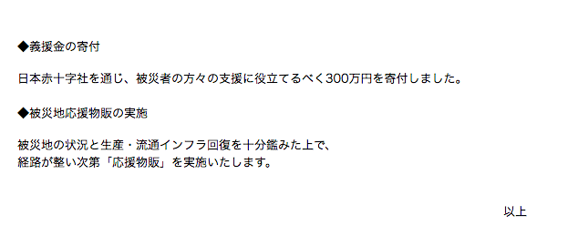 今回の被害状況を踏まえ、人道的な見地から、弊社では下記の通りの支援を行うことといたしました。
