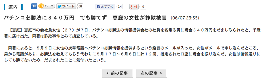 高齢の方をバカにするわけではないんですが、今回の被害者はだいぶ若いので少々意外でした。ちょっと考えれば(もしくは検索したら)分かりそうでなものですが、騙されてしまうんですね。。業界側から「攻略なんかありません!」といえば言うほど訝ってしまう人間心理はわからなくもないんですが、でも攻略なんてないのですよ!夢を見ちゃダメなのですよ!勝ちたいなら市場を調べてデータを取って釘もしくは設定を考えてプレーすることです。