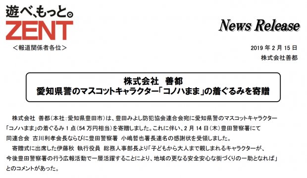ZENTさんが愛知県警のマスコットキャラクターの着ぐるみを寄贈というニュースです。