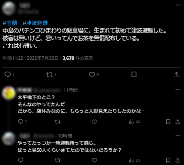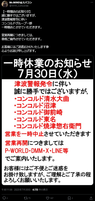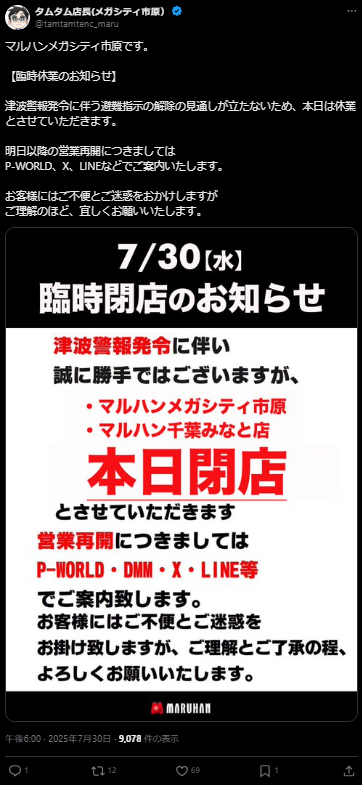 2025年7月30日津波警報発令による各パチンコホールの取り組みをいくつかピックアップ