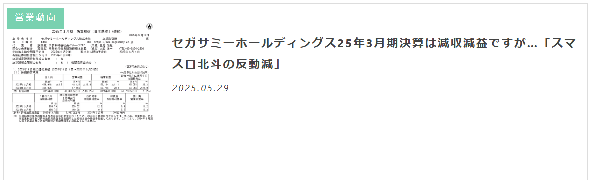 新筐体の投入は業界と共存共栄していくための環境づくり/セガサミーホールディングス決算短信は減収減益