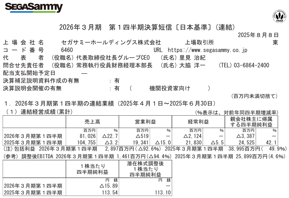 セガサミーホールディングスさんの2026年3月期決算短信を見ていきます。