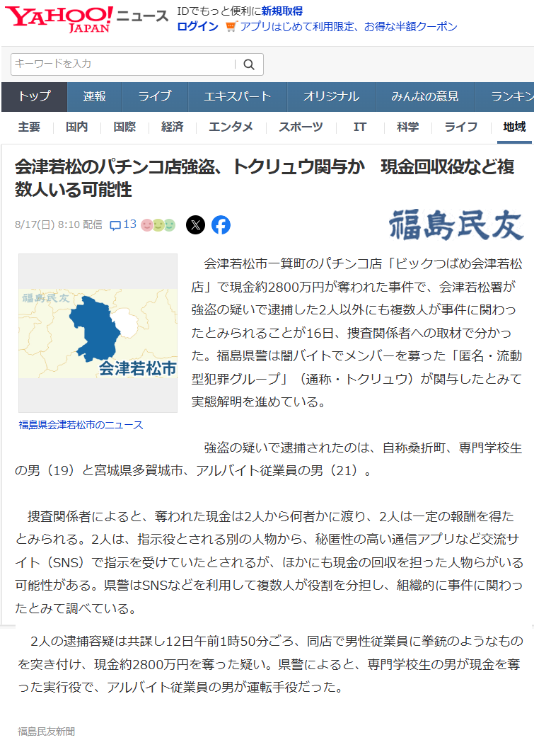 会津若松のパチンコ店強盗、トクリュウ関与か 現金回収役など複数人いる可能性(福島民友新聞) – Yahoo!ニュース