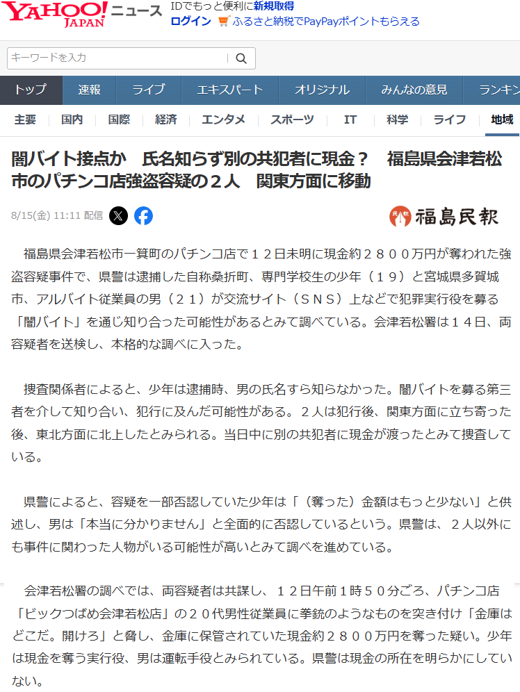SNSで指示か 会津若松・パチンコ店強盗、事件後に関東方面へ移動(福島民友新聞) – Yahoo!ニュース