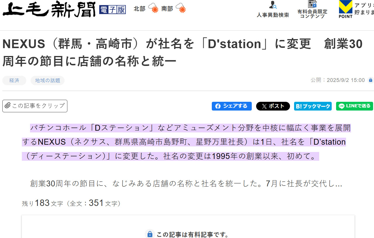 >パチンコホール「Dステーション」などアミューズメント分野を中核に幅広く事業を展開するNEXUS(ネクサス、群馬県高崎市島野町、星野万里社長)は1日、社名を「D’station(ディーステーション)」に変更した。社名の変更は1995年の創業以来、初めて。