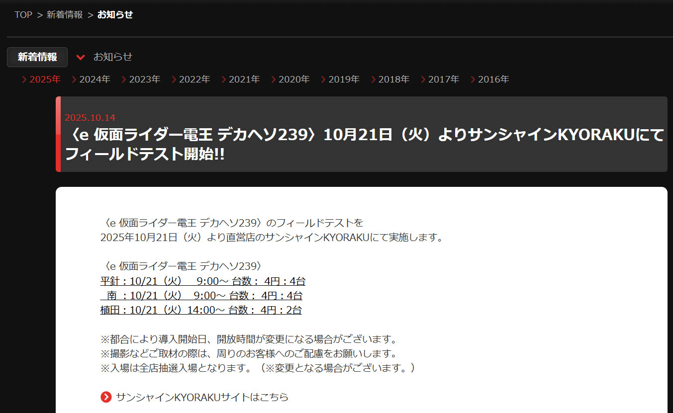 e 仮面ライダー電王 デカヘソ239について、2025年10月21日(火)よりサンシャインKYORAKUにてフィールドテストを開始という話題ですね。