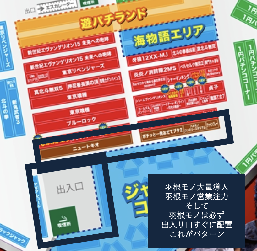 該当店舗は羽根モノを固めて、羽根モノプレイヤーを島に誘導して、滞在時間や売上を上げていく方針です。