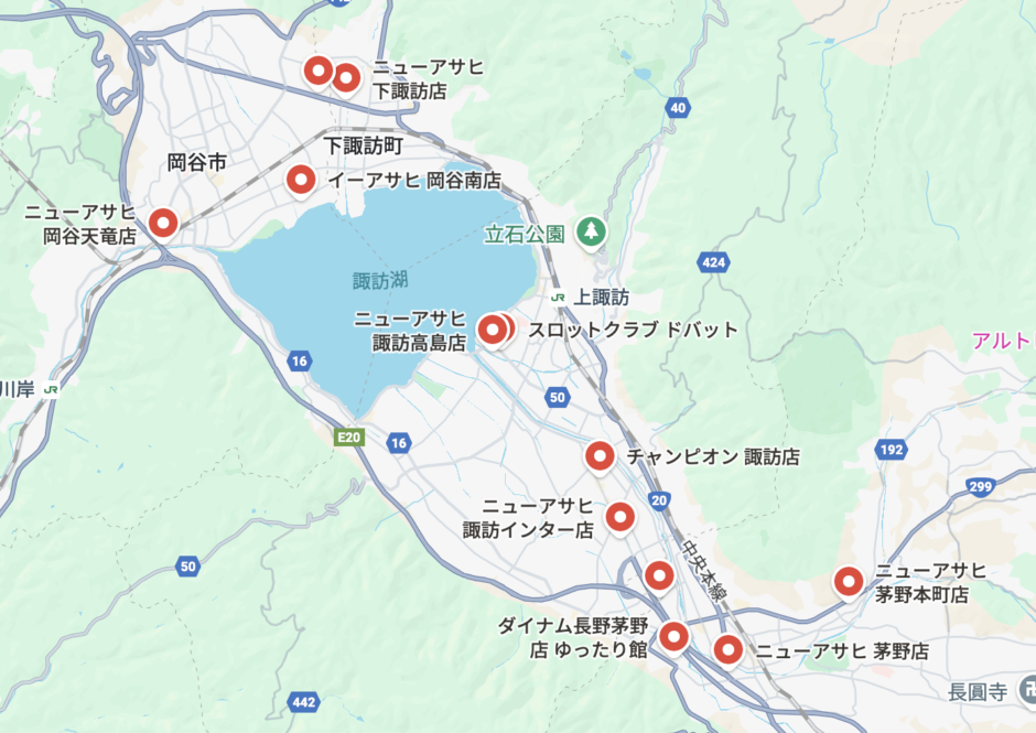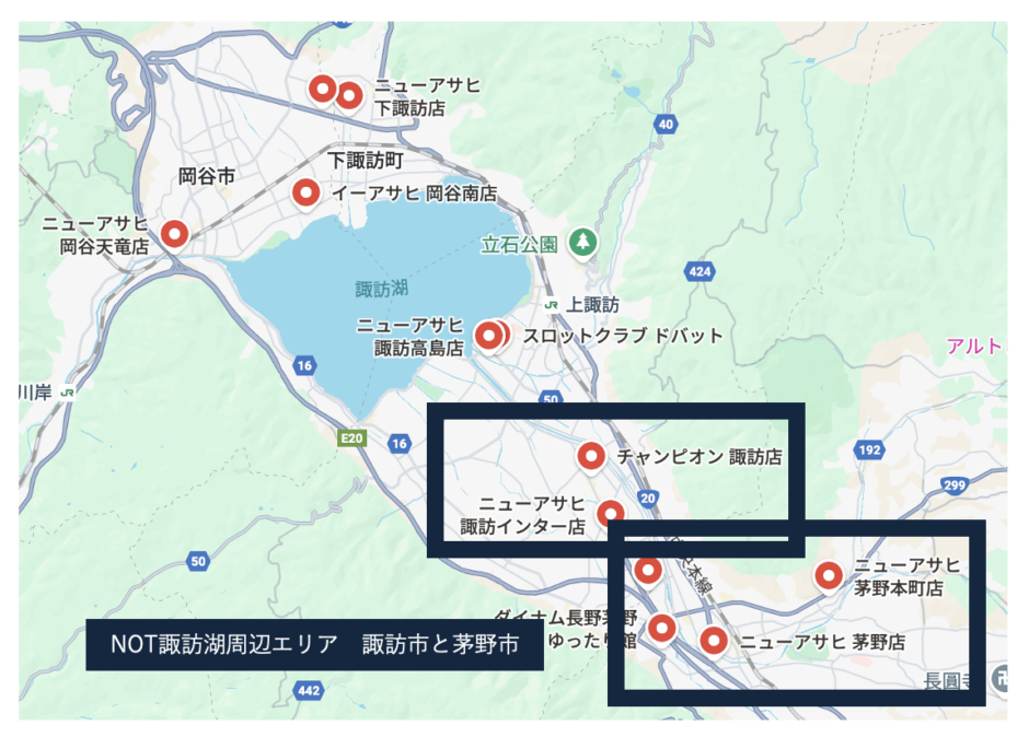 上記の通り、諏訪湖をぐるっと取り囲むスタイルでパチンコホール店舗が存在。