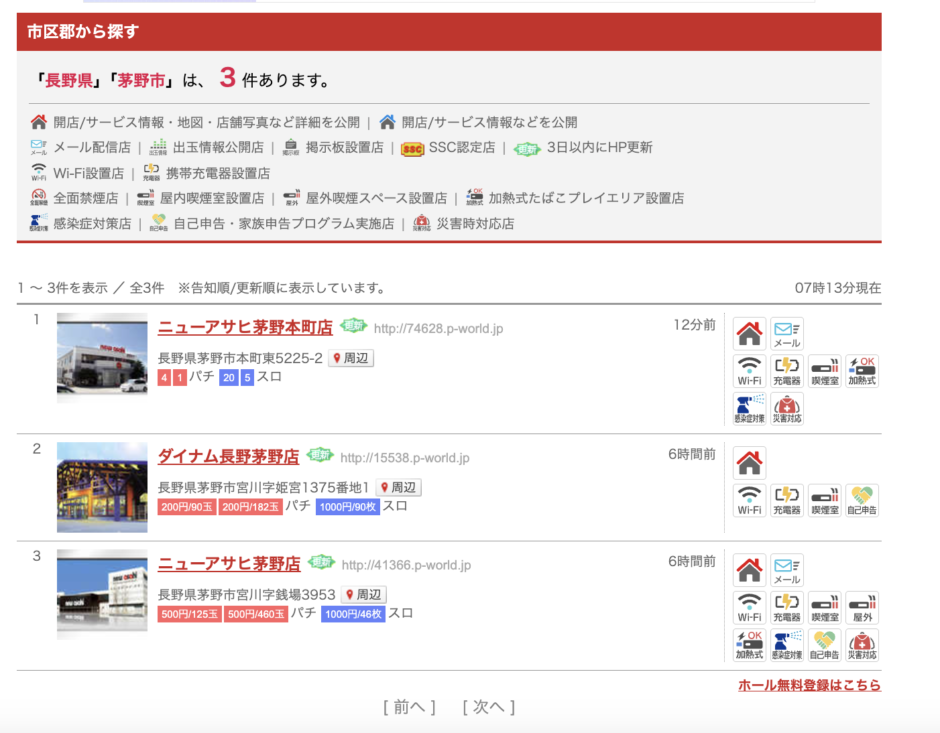 茅野市におけるパチンコホールは3件。内2件が系列店舗。