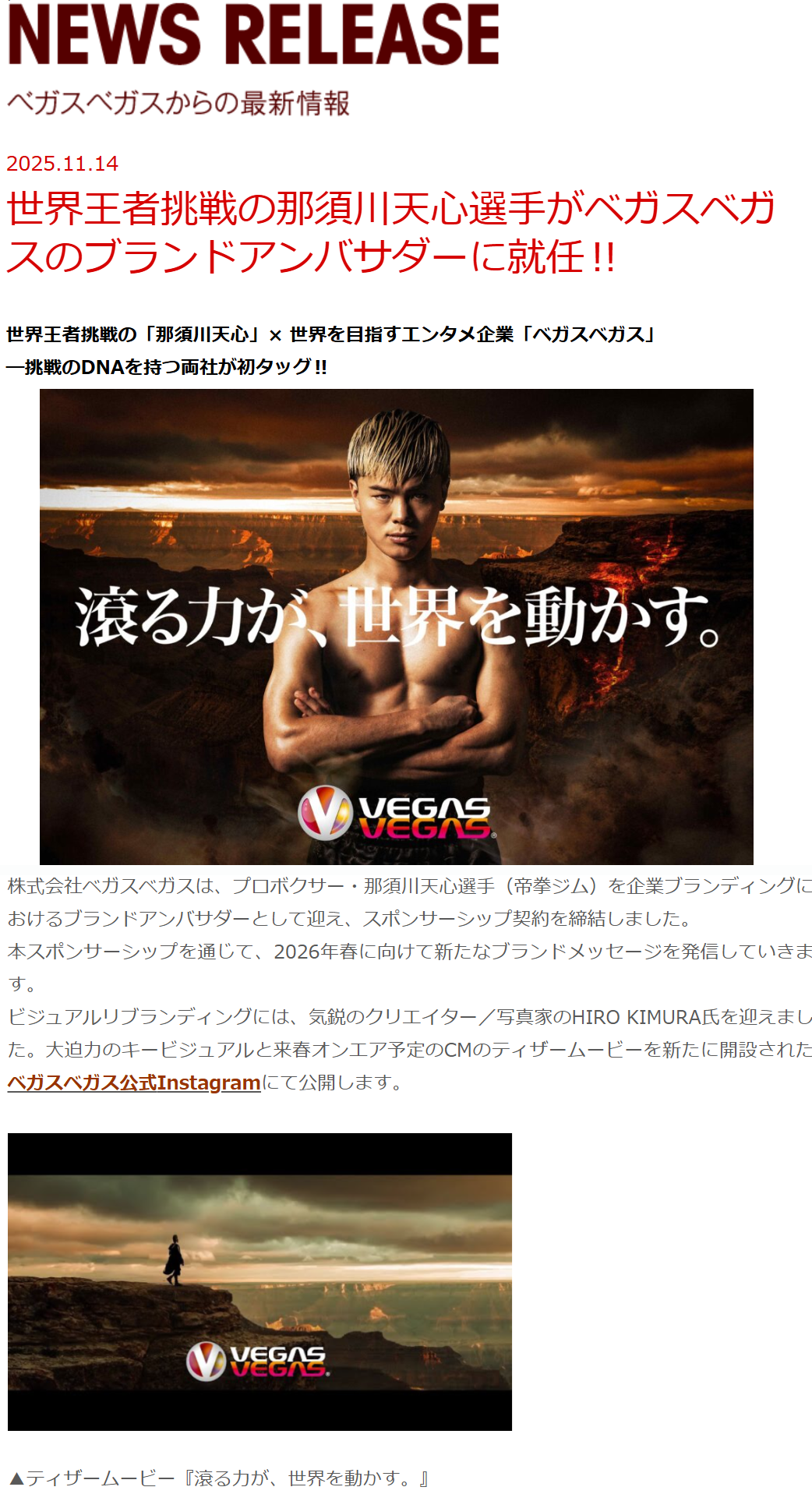 世界王者挑戦の那須川天心選手がベガスベガスのブランドアンバサダーに就任‼ | ニュースリリース | 式会社ベガスベガス