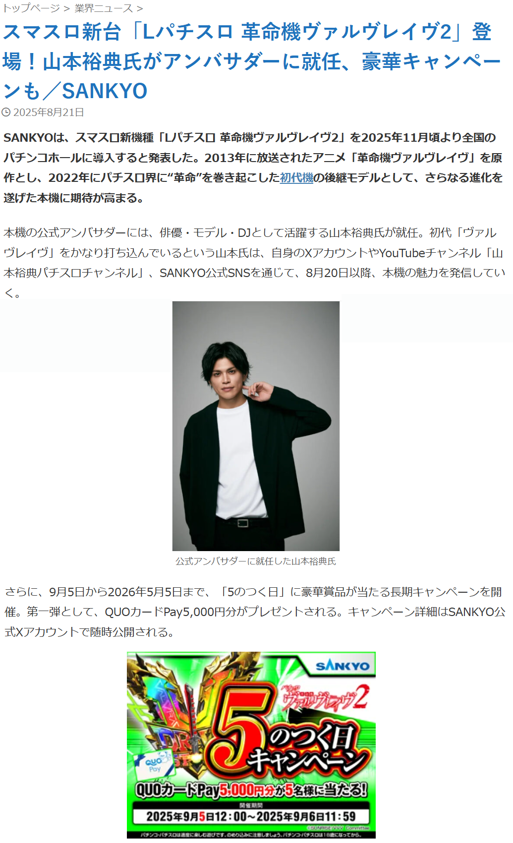 スマスロ新台「Lパチスロ 革命機ヴァルヴレイヴ2」登場!山本裕典氏がアンバサダーに就任、豪華キャンペーンも/SANKYO – 『遊技日本』
