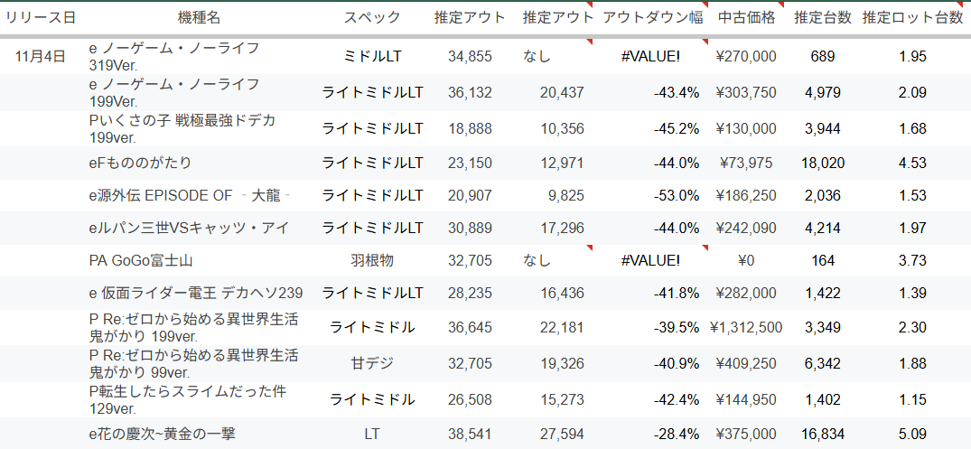 一方、他のe機種群は概ね40%前後のアウトダウンが続いており、特に e源外伝(‐53%)、Pいくさの子(‐45.2%)、eノーゲーム・ノーライフ 199Ver.(‐43.4%) など、早くも稼働の落ち込みが顕著なタイトルが複数見られます。