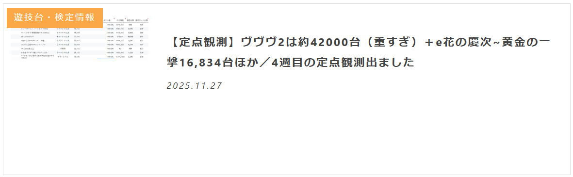 総じて、今回の定点観測で特筆すべきは 「慶次黄金の一撃」の強さが一段抜けている点 であり、その他の主要タイトルは横並びで40%前後のダウンに収束しています。