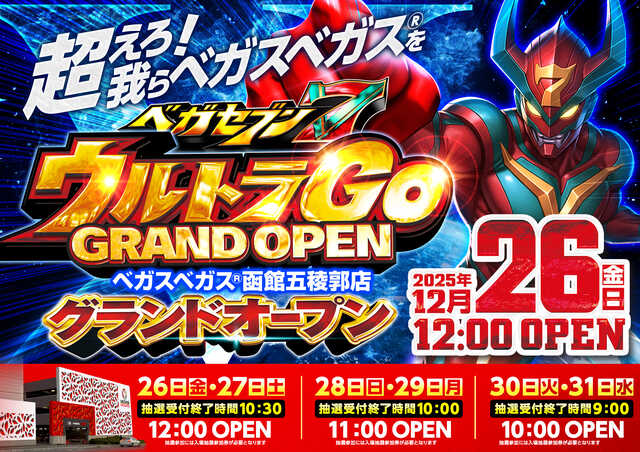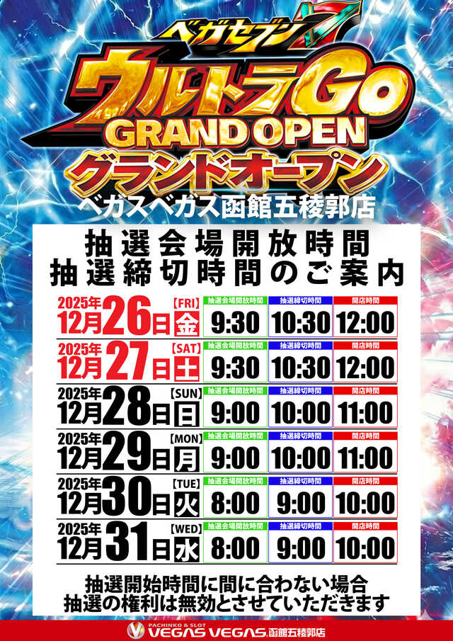 12/31(水)午前10時開店・・・約530枚— ベガスベガス函館五稜郭店 (@VVgoryokaku) December 20, 2025
