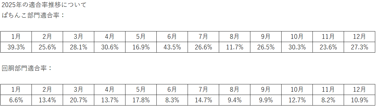 回胴部門適合率:→10.9%