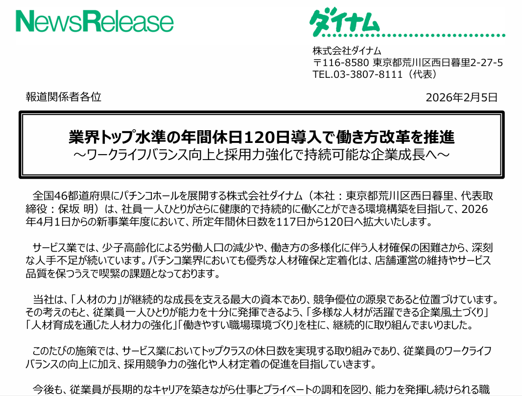 >全国46都道府県にパチンコホールを展開する株式会社ダイナム(本社:東京都荒川区西日暮里、代表取締役:保坂 明)は、社員一人ひとりがさらに健康的で持続的に働くことができる環境構築を目指して、2026年4月1日からの新事業年度において、所定年間休日数を117日から120日へ拡大いたします。